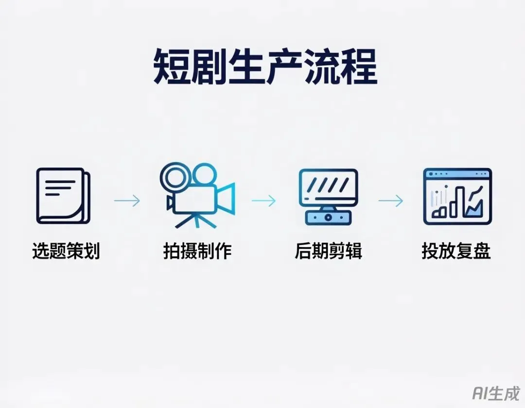 选题雷达 → 爆点提炼 → 角色/关系预制 → 剧情骨架(模块化) → 分集脚本(钩子清单) → 分镜模板 → 拍摄清单 → 现场执行 → 粗剪快审 → 精剪包装 → 多版本出片 → 素材切片 → 投放测试 → 数据复盘 → 下轮迭代