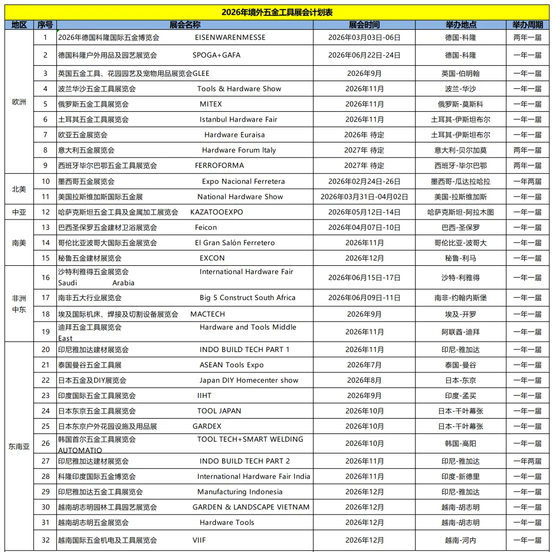 2026年全球五金工具展会计划表