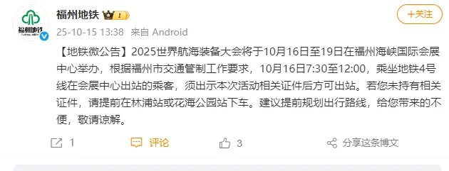 2025世界航海装备大会将于10月16日至19日在福州海峡国际会展中心举办,根据福州市交通管制工作要求,10月16日7:30至12:00,乘坐地铁4号线在会展中心出站的乘客,须出示本次活动相关证件后方可出站。若您未持有相关证件,请提前在林浦站或花海公园站下车。