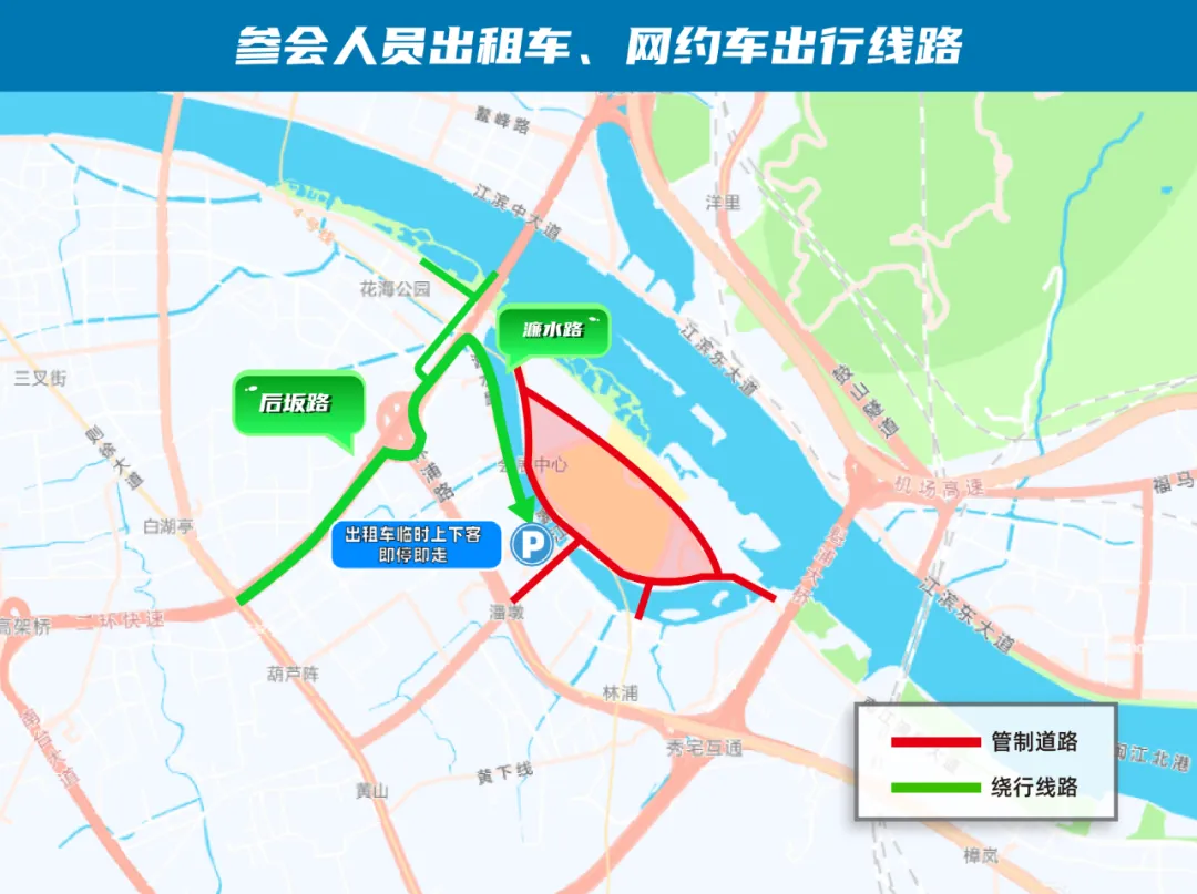 1.三环路方向来的车辆可由秀宅互通南江滨大道出口进入三环路辅路,后经南江滨东大道—浦下洲路—会展东路—会展东路出租车下车点。