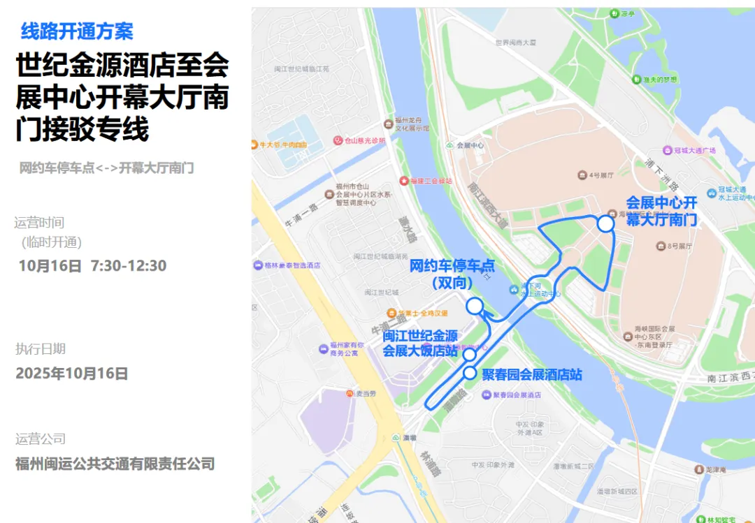 潘墩路濂水路口西侧路段网约车下车点—濂水路—潘墩路(林浦路口调头)—会展环岛—会展中心南广场,车辆停靠闽江世纪金源会展大饭店公交车站和聚春园会展酒店公交车站(人员凭大会专用证件上下车)。