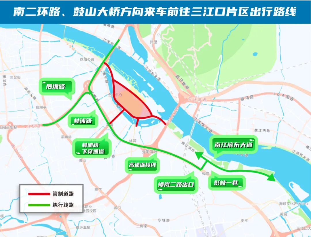 南二环路、鼓山大桥方向往来的车辆:可由后坂路—林浦路—林浦路下穿通道—高速连接线—樟岚二路出口—高速连接线辅路—彭岐一巷—南江滨东大道行驶—前往三江口片区的金沙公园、梁厝等地。