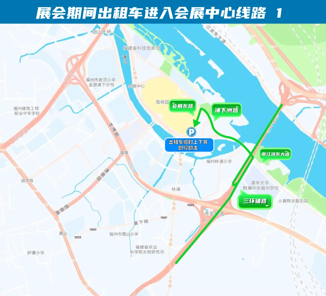 3.南江滨西大道(上渡、仓前、连江路方向)来的车辆可由南江滨西大道—会展西路—会展西路出租车下车点。