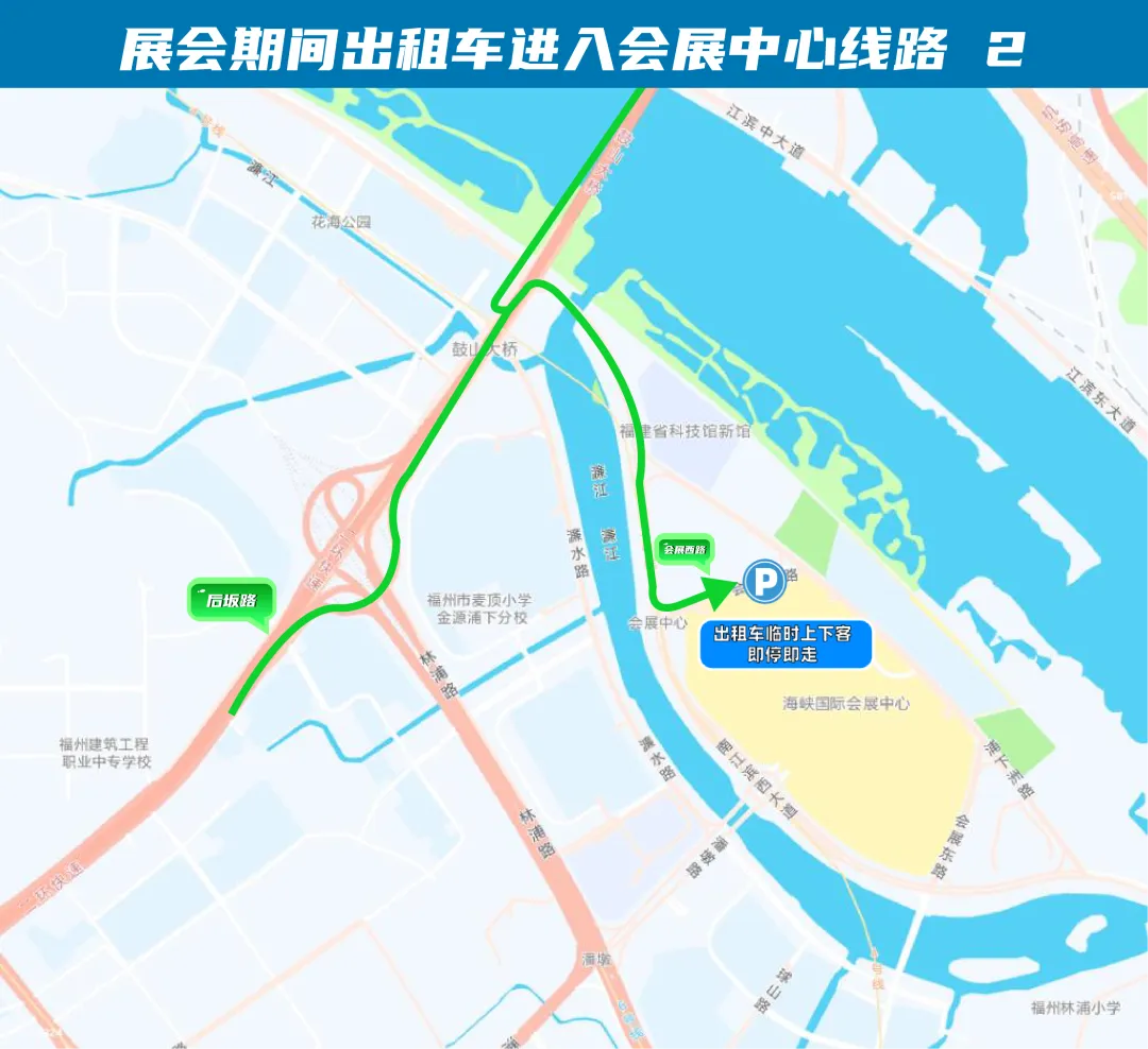 2.南二环路、鼓山大桥方向来的车辆可由后坂路—南江滨大道—会展西路—会展西路出租车下车点。