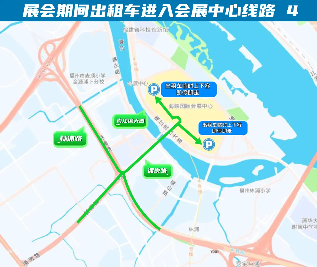 4.会展中心内部通道较为畅通时,林浦路、潘墩路方向来的车辆可由展城环岛进入会展中心内部通道,停放在1号馆、5号馆前定点出租车停车区上下客。