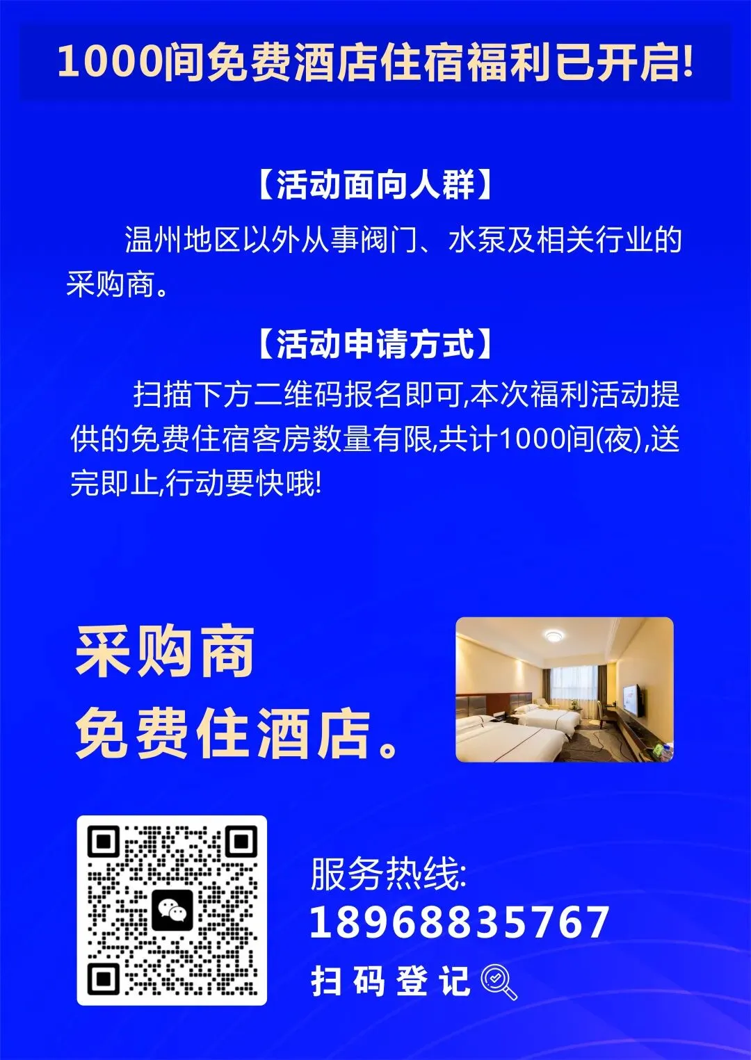 组委会为深化专业观众的优享观展服务,为温州地区以外从事阀门、水泵及相关行业的采购商提供展会期间1晚酒店免费住宿,提前申请报名,无忧入住!