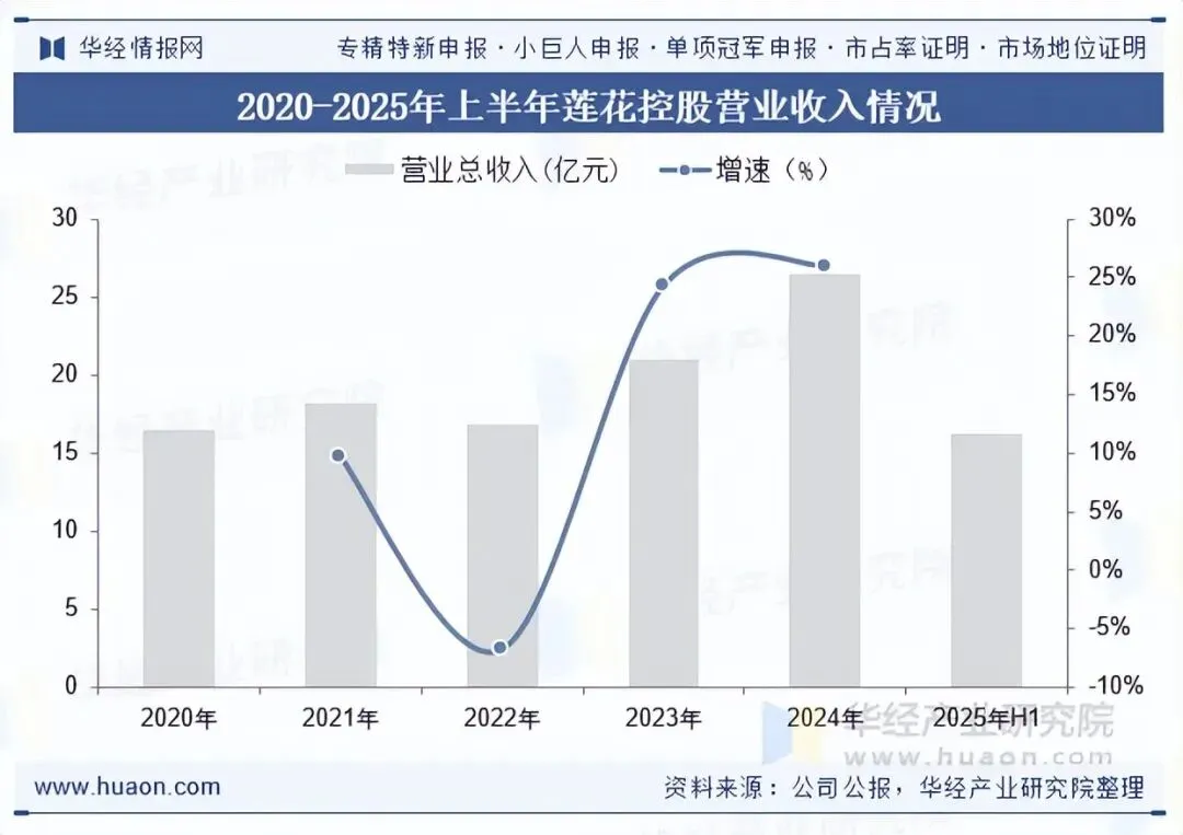 莲花控股股份有限公司创建于1983年,是一家以调味品和健康食品研发、生产和销售为主营业务的上市企业。莲花控股的主导产品莲花味精长期占据中国家庭装市场主导地位,现已形成以粮食酿造味精为代表的氨基酸调味品,以松茸鲜、鸡精、鸡汁为代表的复合调味品,以火锅底料、小龙虾调味料、酸菜鱼佐料等系列为代表的新型复合调味品,以本酿酱油、料酒、醋为代表的液态调味品和以糖类产品系列、面粉、谷朊粉、面包糠等健康调味食品构成的多元化产品体系。2025年上半年,莲花控股营业总收入为16.21亿元。