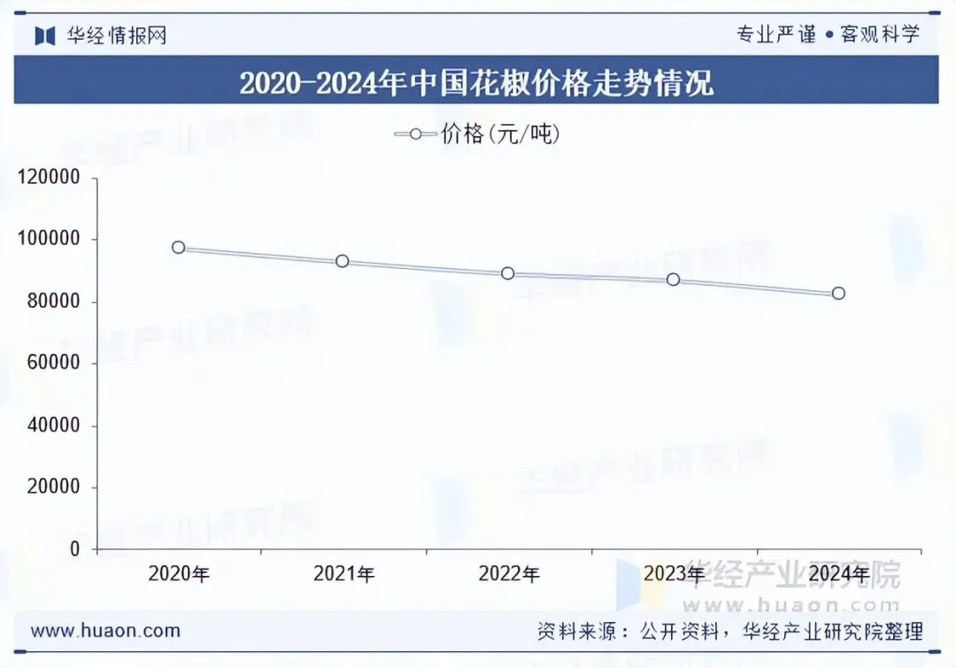 花椒具有喜爱阳光和耐旱的特点,主要分布在重庆江津、四川汉源等地区。伴随着麻辣火锅、冒菜、烤鱼、麻辣风味预制菜及休闲食品的迅速扩展, 大众对食物整体外观和美味需求的增加, 使得具有绿色亮丽、粒大饱满、风味清新绵长的鲜花椒深受消费者的喜爱,市场需求迅速增长。近年,受到花椒栽培技术更新,我屁股IP花椒培育呈现科学化、细致化管理,全国花椒年产量稳定增加,因此价格持续走低,2024年中国花椒价格约为82240元/吨。