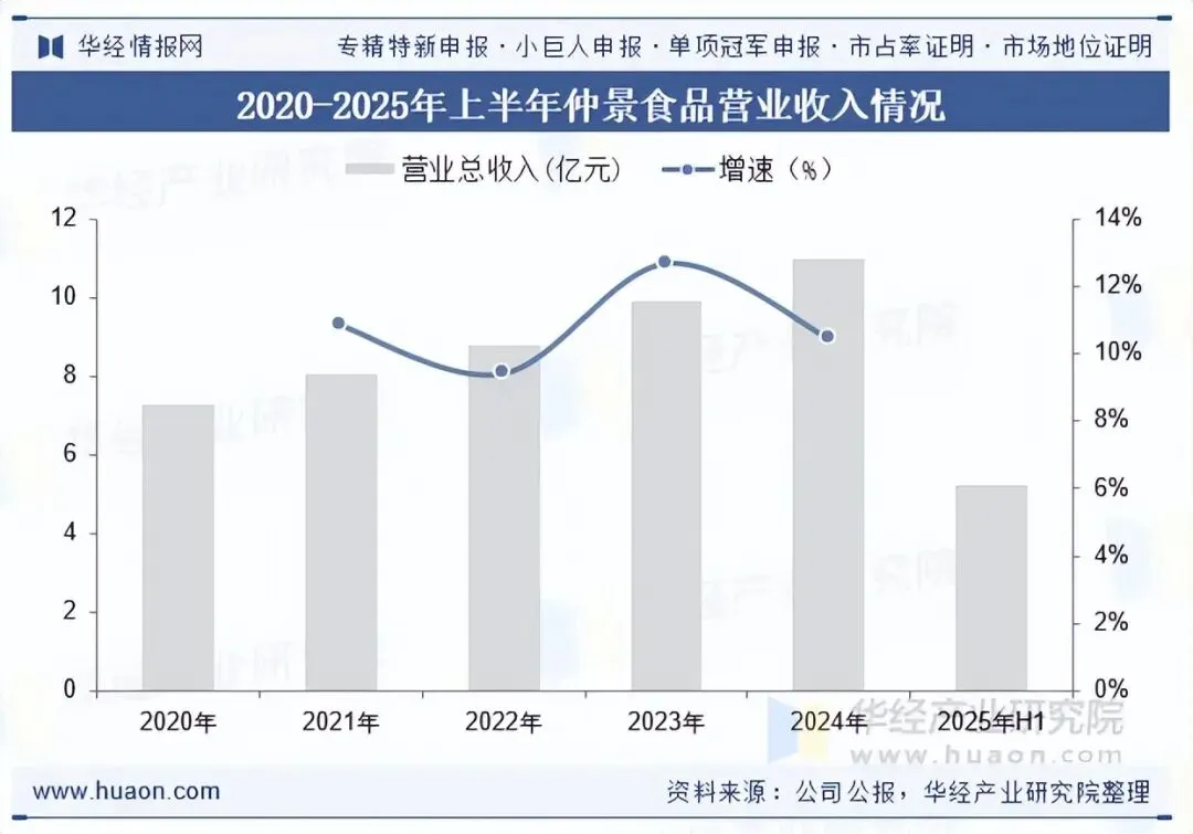 仲景食品股份有限公司专注于调味食品和调味配料的研发、生产与销售,代表产品有仲景香菇酱、上海葱油、鲜花椒油等调味油、黄焖炒鸡等炒菜料和香辛调味配料等,服务于个人家庭、餐饮饭店和食品生产企业。在调味食品领域,开发了仲景上海葱油、2.3°鲜花椒油、快手菜调味料等系列产品;在调味配料领域,料产品涵盖花椒、辣椒、姜、黑胡椒、八角等主要香辛料系列。2025年上半年,仲景食品营业总收入为5.24亿元。