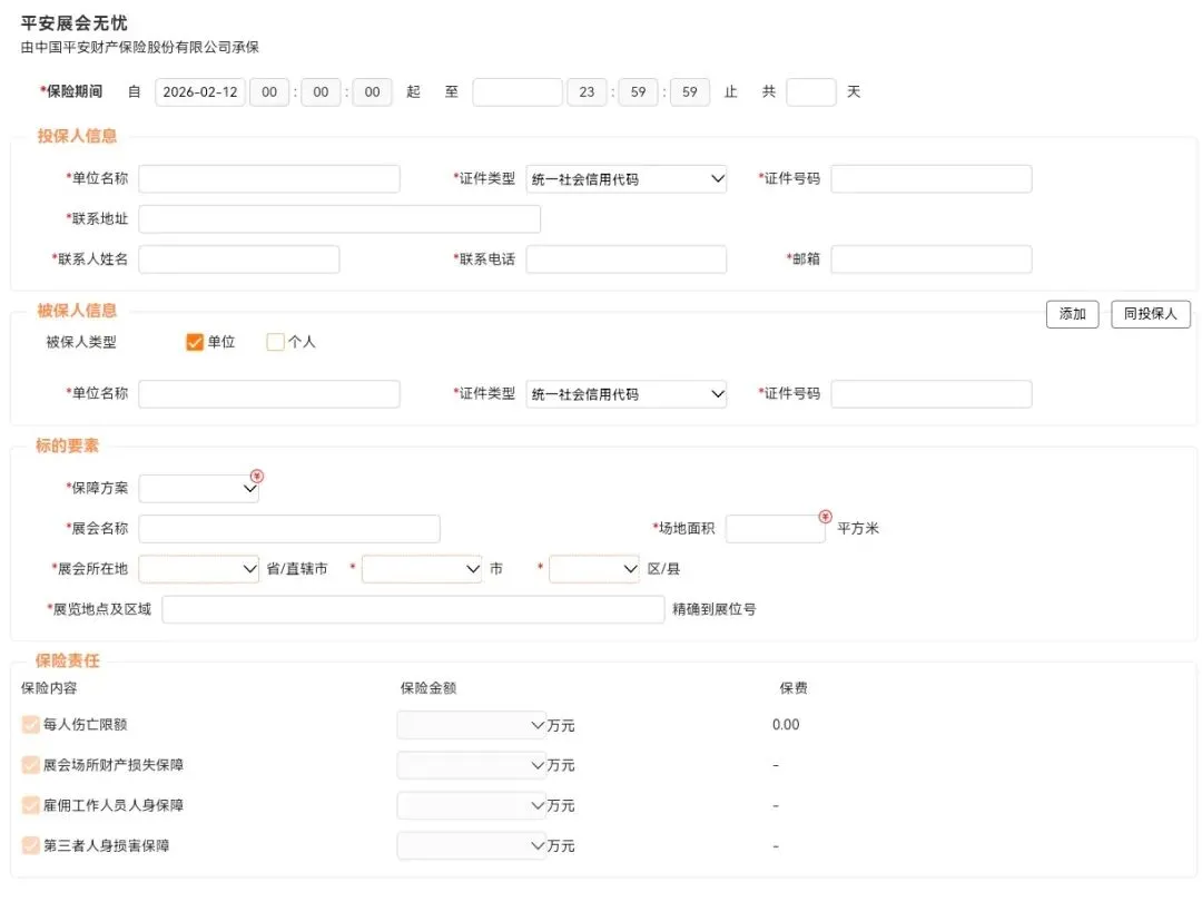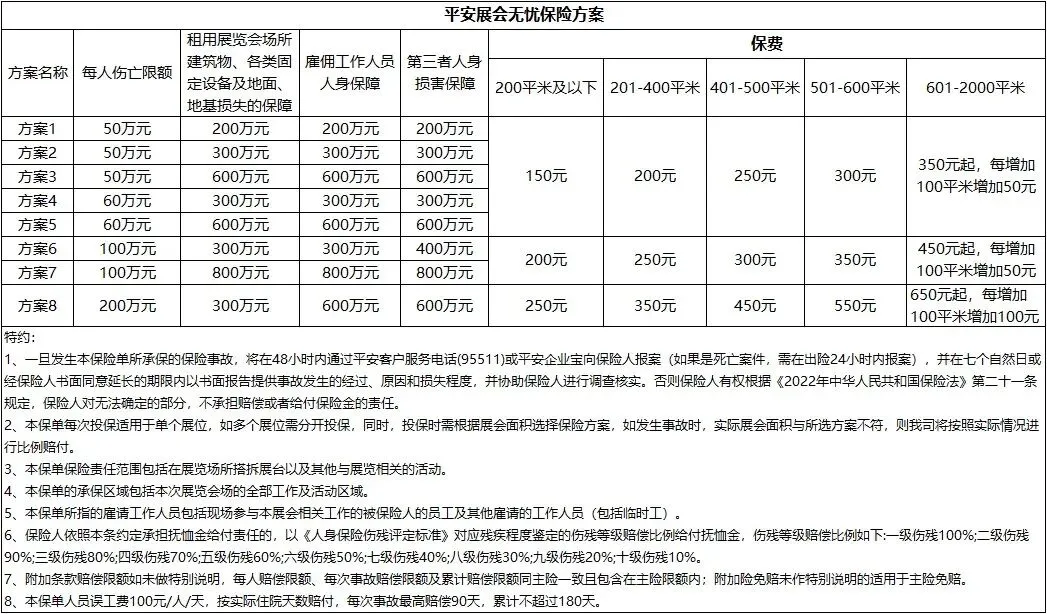 本保单每次投保适用于单个展位,如多个展位需分开投保,同时,投保时需根据展会面积选保险方案,如发生事故时,实际展会面积与所选方案不符,则我司将按照实际情况进行比例赔付。