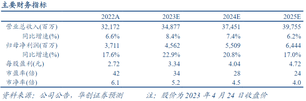 公司发布2023年一季报,23Q1公司实现营业总收入107.1亿元,同增16.3%;归母净利润14.5亿元,同增28.9%,扣非归母净利润为13.5亿元,同增32.1%。经营活动现金净额为18.1亿元,同增94.3%。