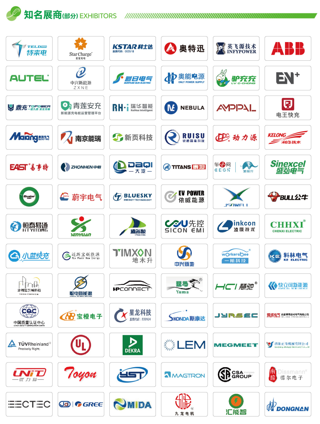 本次展会汇集了众多知名充电设施企业,特来电、星星充电、英飞源、科士达、森源集团、中兴新地、星云股份、驴充充、浦尔顿、EN+科技、瑞华智能、公牛集团、电王快充、科华恒盛、安富新能源、驭马新能源、一航电动、举视新能源、紫龙新能源、中兢大汽、恒泰易通、珠海云充、智慧城、慧驰科技、微芯科技、小充嗨跑、麦格米特、英可瑞、凌康科技、66物联、鹏和科技、地木升、鼎立新能源、及时电、汇能智、帝一新能源、迈斯宝、聪电新能源、 鑫益好、专鑫控股、思华盛、快立可、力盾新能源、蓝能科技、格力新元、青莲安充、纽莱特、珠海小可乐、时代云联、迈依达、泰格莱、英利达、瑞银、莱姆电子、双环电子、冠泰电子、SGS通标、UL、天祥、LEM、东南伟业、斯康达、迪文、优力特、赛特、贝兹德、巨磁智能、红旗集团、弗而兹、等企业将亮相。