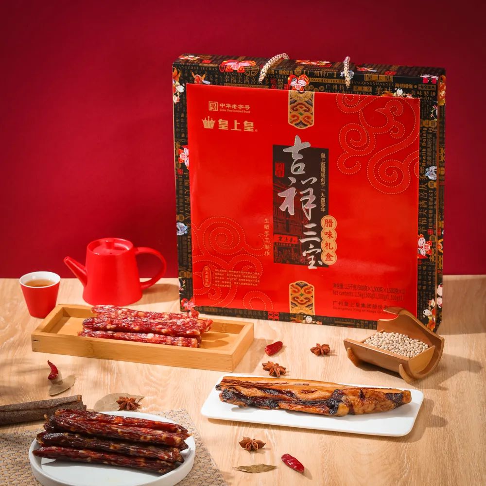 腊味三宝,祝福不少!内含二八腊肠、五花腊肉、鸭肝肠三款经典广式腊味,喜庆礼盒、满载年味。一盒尽显广式情谊。