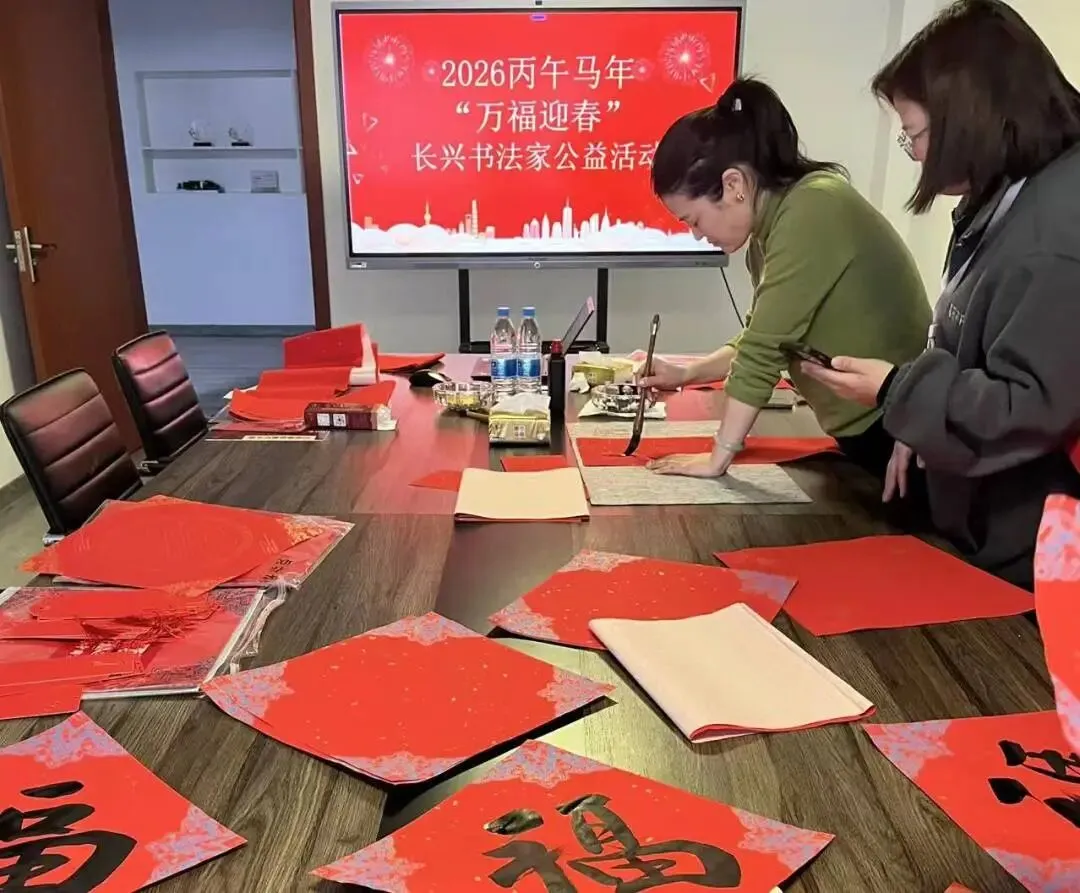 为迎接即将到来的马年,公司特别邀请了长兴书法家协会的邱老师来到现场,为员工们亲手书写春联。每位同事都提前准备了心中所想的吉祥语,在邱老师运笔挥毫之间,一句句祝福落于纸上,喜庆的年味也随之弥漫开来。大家围在一起,静静等待墨迹干透,再小心地将这份带着温度的祝福带回家中。
