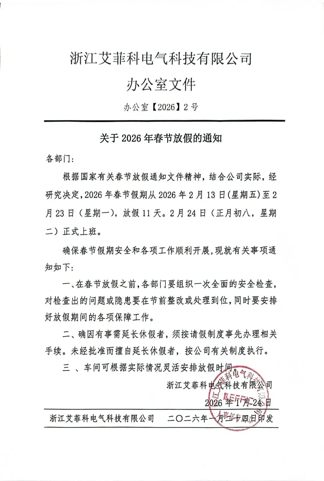 2026年浙江艾菲科电气科技有限公司放假时间为: