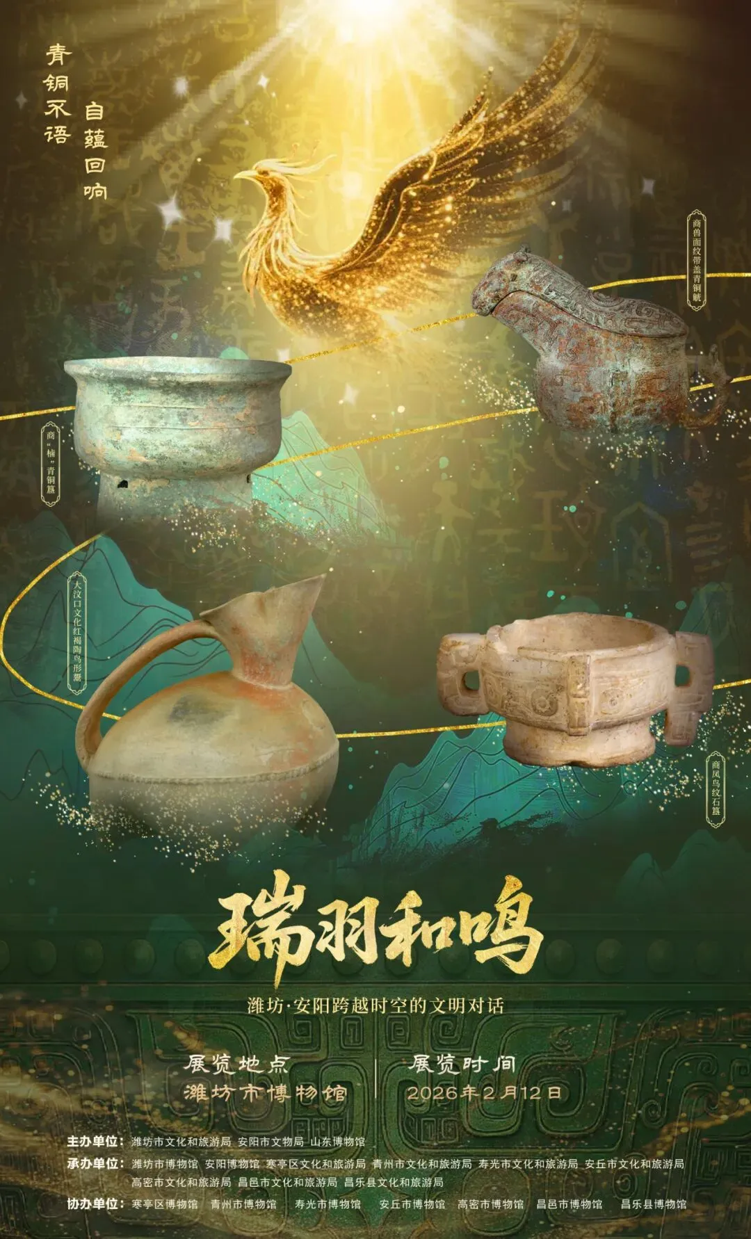 2026年2月12日至5月20日,一场题为“瑞羽和鸣——潍坊·安阳跨越时空的文明对话”的大型文物展览将在潍坊市博物馆举行。本次展览由潍坊市文化和旅游局、安阳市文物局、山东博物馆联合主办,潍坊市博物馆、安阳博物馆及潍坊下辖多个县市区文旅单位共同承办,汇集十家国有博物馆的珍贵馆藏,以文物实证阐述海岱东夷与中原殷商文明之间的深厚渊源与交融互鉴。