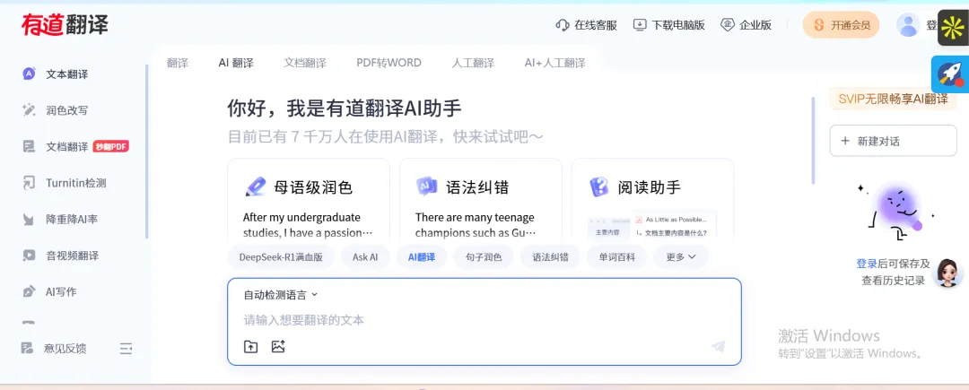 这款翻译工具集成了AI智能技术,功能丰富全面。除支持文本、网页翻译外,还提供内容润色与语法纠错等功能。同时具备文档翻译能力,并推出手机端应用,方便随时使用。