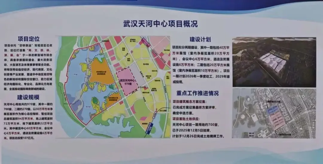 【微信公众号:WH青春空港】:2026年2月10日,微信公众号:武汉空港新城发布文章《新汉口 境启华章|城投·空港华府示范区盛装绽放 定义时代人居新范本》,该文章主要介绍的是武汉盘龙城首个“真四代住宅”-城投·空港华府项目,文中透露出一个最新的信息是武汉天河中心(原武汉天河国际会展中心)的最新效果图。有网友细心的发现该图与黄陂区2026年“两会”召开之前有关部门接待区政协委员和区人大代表时所展示的项目《武汉天河中心》中的效果图是一模一样的。小编也仔细查看了一下该效果图,两张图确实是一样的。这也就充分的说明大家十分关注的武汉天河中心项目(原武汉天河国际会展中心)的方案设计图大概率已经确定了,并且小编觉得该效果图与原来绿地集团建设时的设计效果图有些相似,大家觉得怎么样?欢迎留言讨论!△黄陂区2026年“两会”召开之前有关部门接待区政协委员和区人大代表时所展示的项目《武汉天河中心》△声明:本文素材来源于武汉空港新城!本平台仅作非盈利性质资讯分享使用,不涉及任何实质性建议;如需转载,请保持文章信息及观点的完整性与客观性,如因擅自篡改、误读文章相关信息而产生的任何责任,将由转载方全权承担,本公众号拥有对此声明的最终解释权。