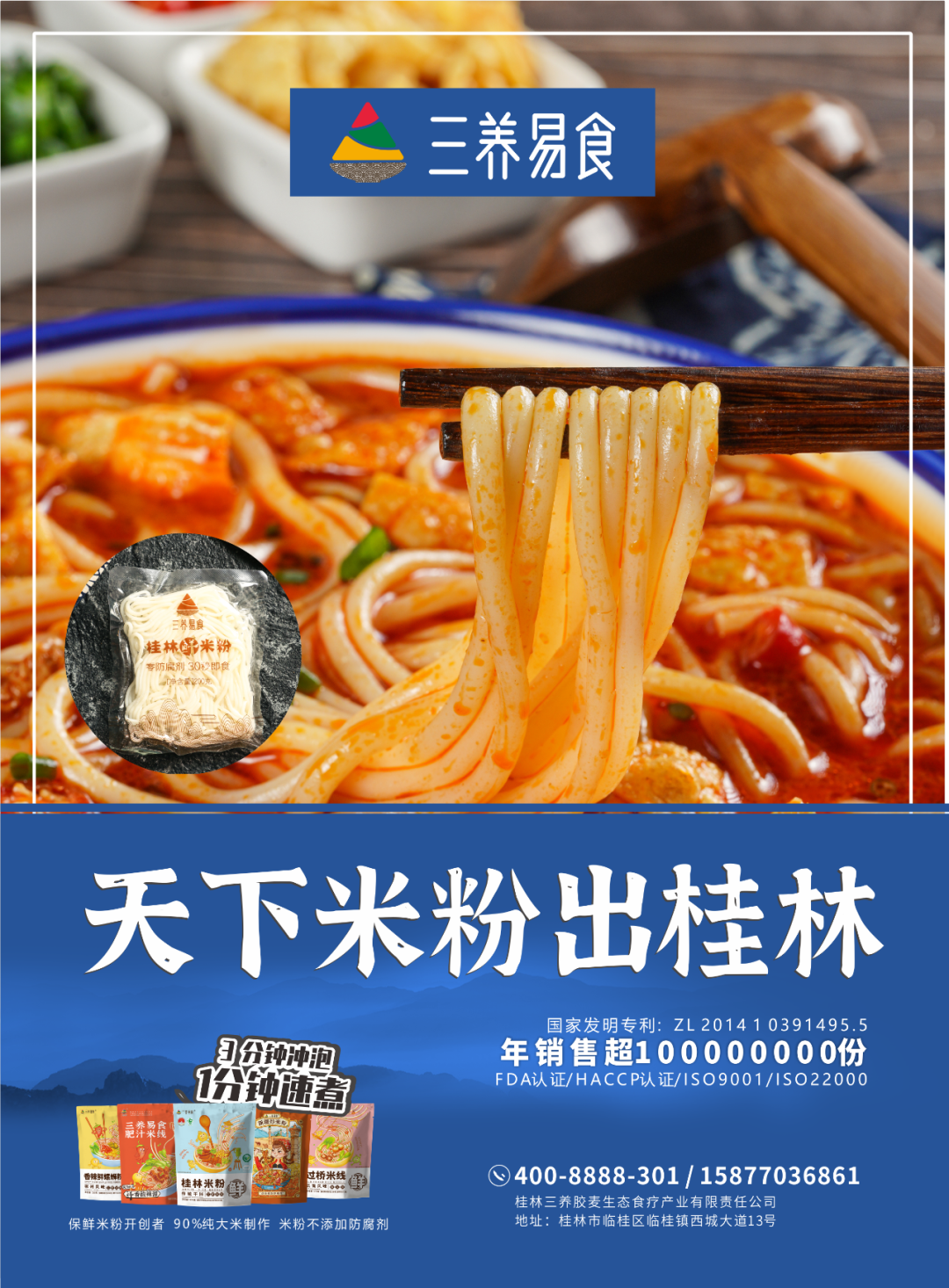 桂林三养胶麦生态食疗产业有限责任公司,是一家在健康快消食品领域内,拥有国际领先的完全自主知识产权核心技术,集产品研发、生产、销售、服务于一体的高新技术科技创新型企业。公司拥有发明专利3项、实用新型专利10项 ,目前正在申报的专利有5项。公司研发的保鲜湿米粉技术属世界首创:90%以上纯大米制作、121℃高温灭菌、非真空、零防腐剂、常温保鲜12个月,1分钟速食。公司也是保鲜湿米粉品类的开创者,保鲜湿米粉取得国家发明专利,国内国模最大的保鲜湿米粉生产企业,首家将保鲜桂林米粉走出国门的企业,国家公益项目“非粮农作物主食化”示范单位,桂林市政府“十三五”规划重点扶持发展企业,广西农业产业化重点龙头企业,桂林米粉协会会长单位。