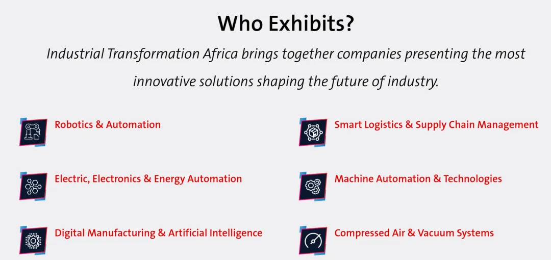 该展览会,每年一届,旨在打造非洲工业制造的专业平台,推动工业4.0、自动化与智能制造的发展。展览会拟定五大主题,机器人与自动化制造,智能物流,工业能源,数字化制造,机械自动与技术。