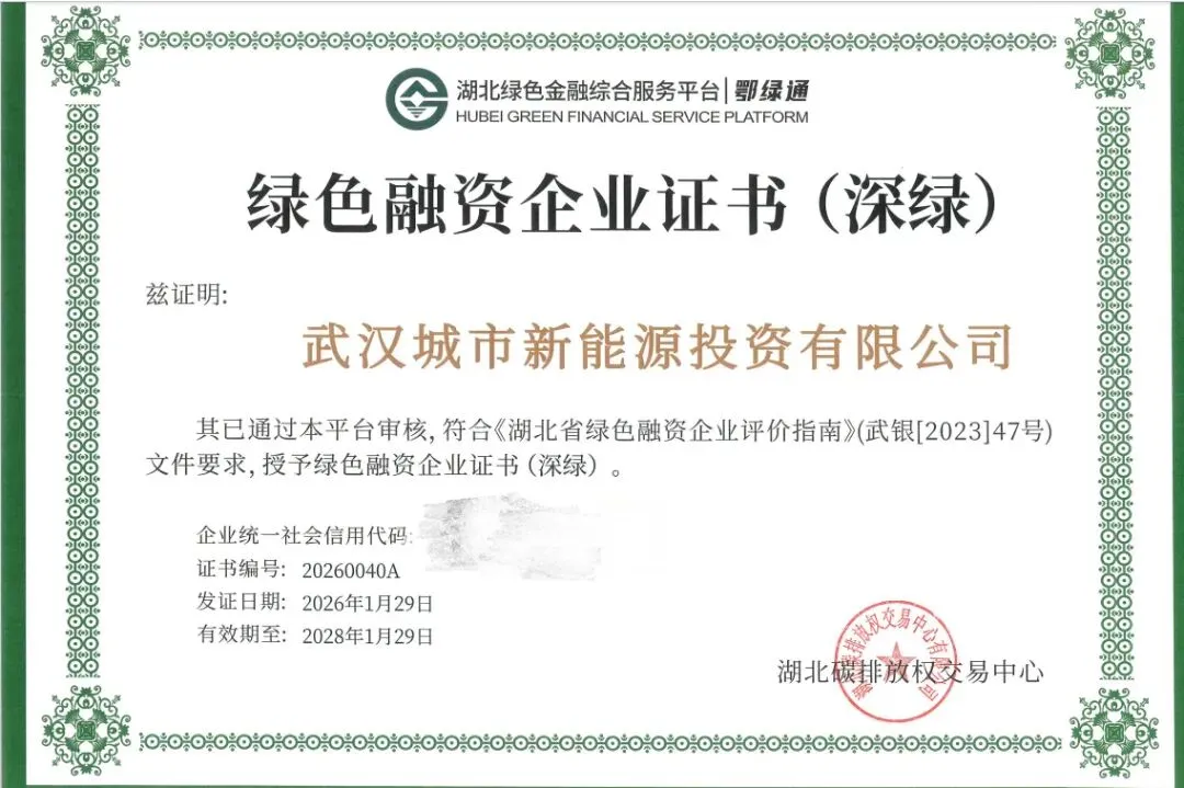近日,新能投公司成功通过绿色融资企业“深绿”认证,该认证由湖北碳排放权交易中心有限公司颁发,主要评估企业在绿色经营生产、环境管理、资源利用等方面的综合表现,标志着企业在绿色转型、节能减排与可持续发展方面取得的成就获得权威认可。