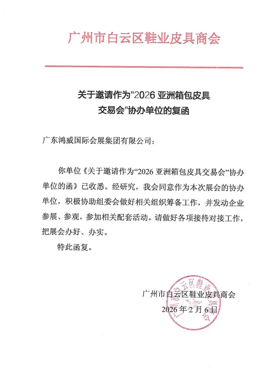 广州市白云区鞋业皮具商会正式确认,将以【协办单位】的身份,深度参与亚洲箱包皮具交易会!