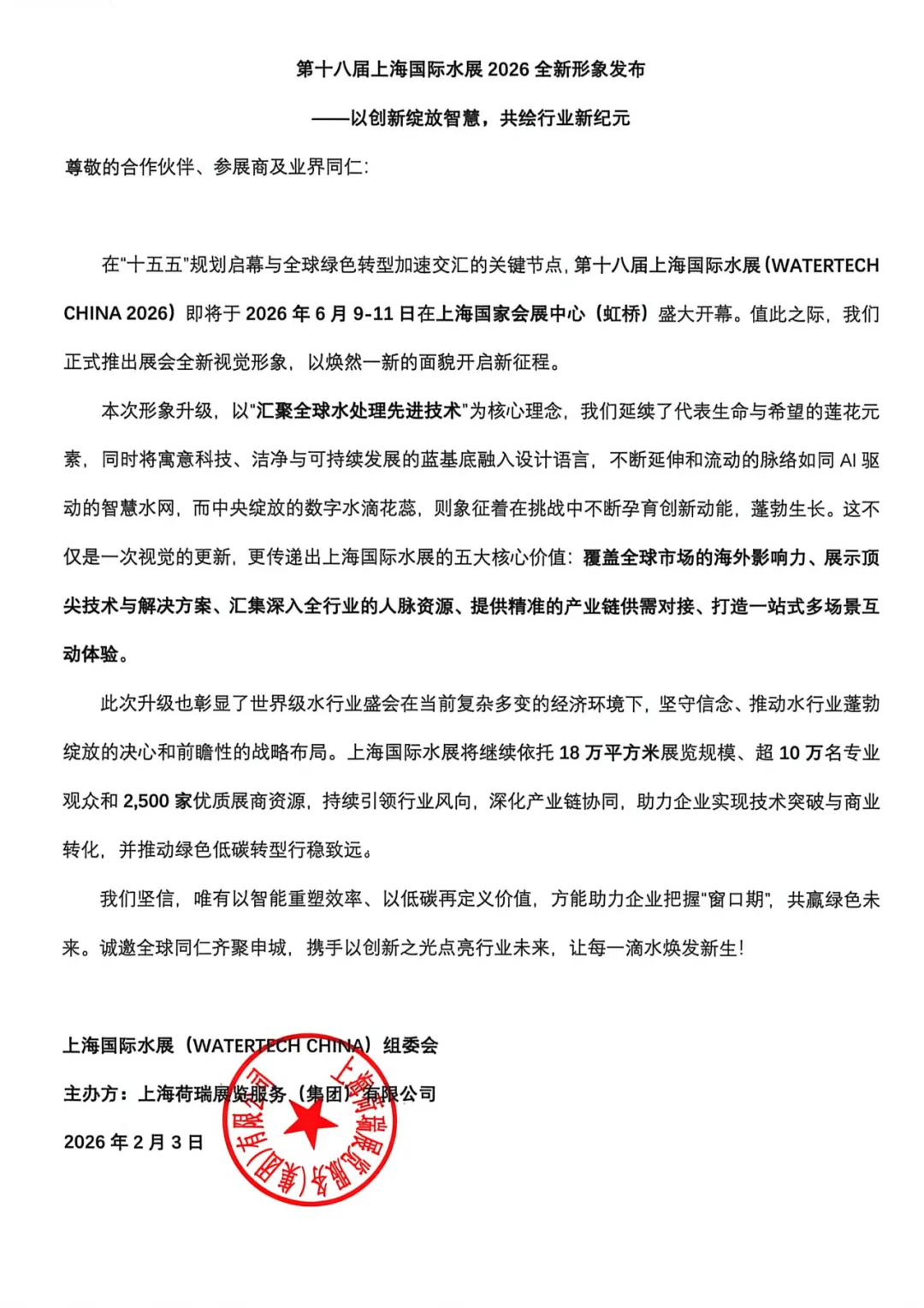 新春将至,万象更新!在“十五五”规划启幕与全球绿色转型加速交汇的关键节点,第十八届上海国际水展(WATERTECH CHINA 2026)即将于2026年6月9-11日在上海国家会展中心(虹桥)盛大开幕。值此之际,我们正式推出展会全新视觉形象,以焕然一新的面貌开启新征程。