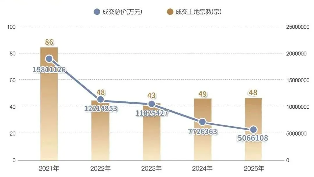 成交宗数变化不大,但成交金额却下降很大。从23年的1182亿,每况愈下,跌到了25年的506亿,直接腰斩。