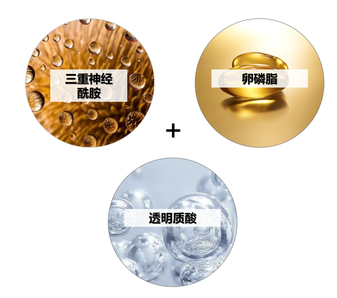 三重神经酰胺+卵磷脂+透明质酸:神经酰胺2、神经酰胺 3、神经酰胺6II 、通过补充人体同源物质,模拟皮肤自身人工屏障,快速提升皮肤角质层中神经酰胺含量,改善皮肤干燥、脱屑、粗糙等状况。配合卵磷脂和透明质酸协同作用,能增加表皮角质层厚度,提高皮肤持水能力,减少皱纹,增强皮肤弹性,进而构建、促生柔韧健康的肌肤屏障。