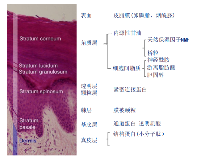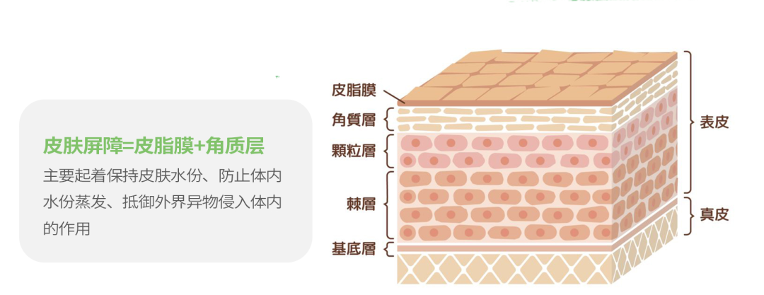 肌肤屏障主要是指皮肤表层的一种物理性的屏障,主要由角质层和皮脂膜构成。角质细胞犹如砖头一样,由脂质将角质细胞紧密连接到一起形成砖墙结构,加上表面附着汗液和皮脂组成的保护膜,共同构成皮肤的“保护层”。