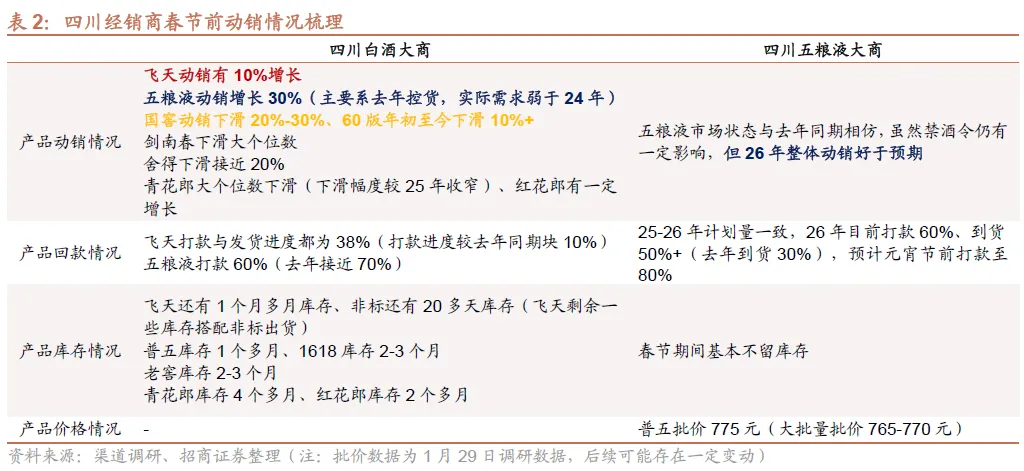 四川地区飞天动销双位数增长,五粮液由于25年春节控货因素而流速明显加快、26年动销好于预期,飞天保留少量库存、五粮液库存良性、经销商多选择旺季出货。国窖动销双位数下滑,其他品牌出现不同程度的下滑。