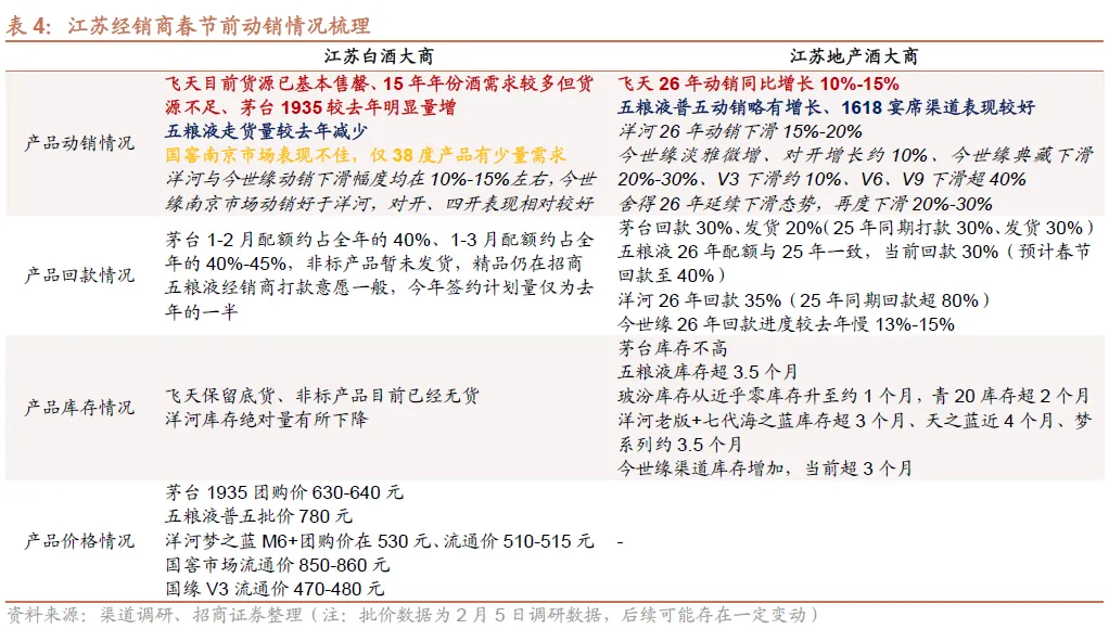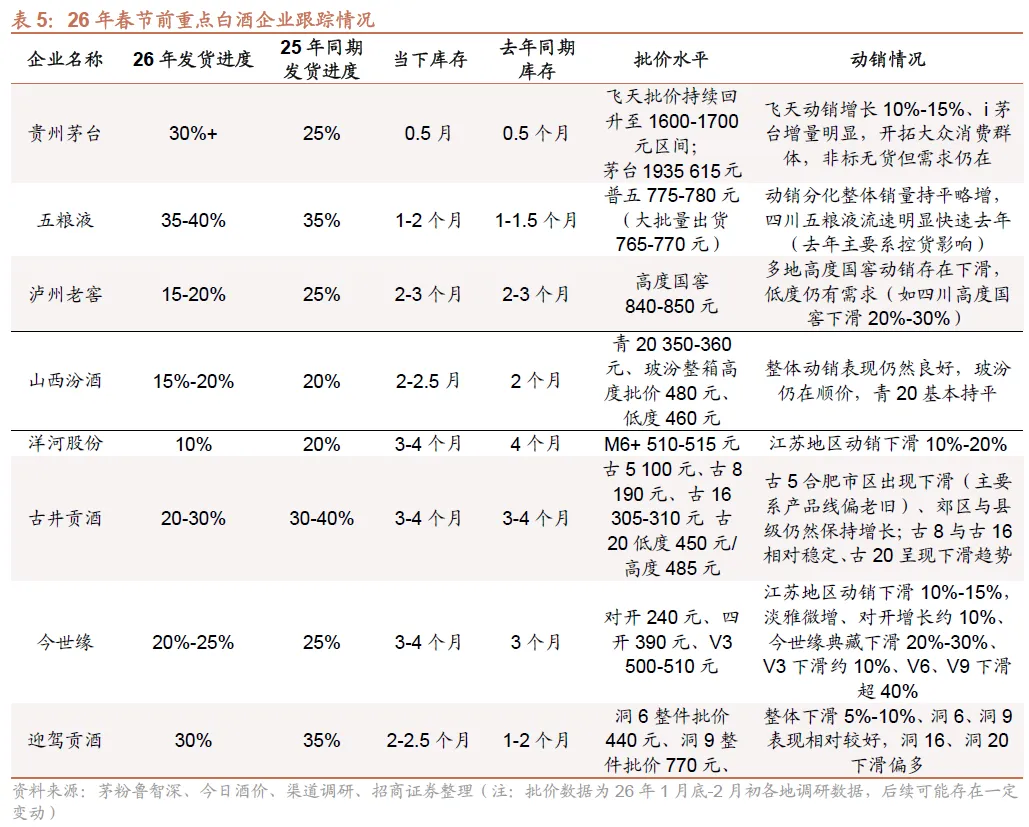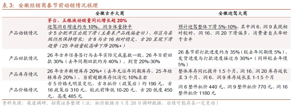 迎驾贡酒:渠道调研反馈,26年春节前打款35%(较去年同期慢5%)、发货30%+(较去年慢5%),企业相对审慎不过多压货,酒厂要求3月底完成50%打款,预计春节期间整体动销下滑5%-10%,洞6、洞9表现相对较好,自点率持续提升。洞16、洞20下滑偏多,整体库存同比提升。