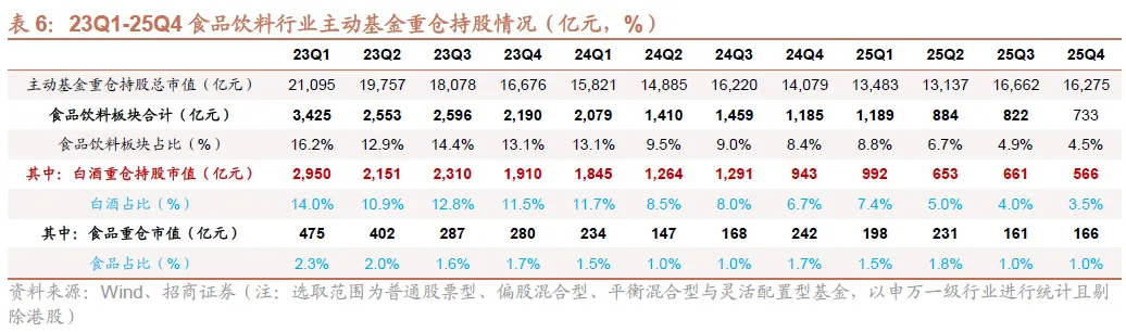 1)行业整体来看:25Q4主动基金食品饮料行业重仓持股市值总额为733亿元(yoy-38.2%、qoq-10.9%),重仓占比为4.5%(yoy-3.9pct、qoq-0.4pct)。