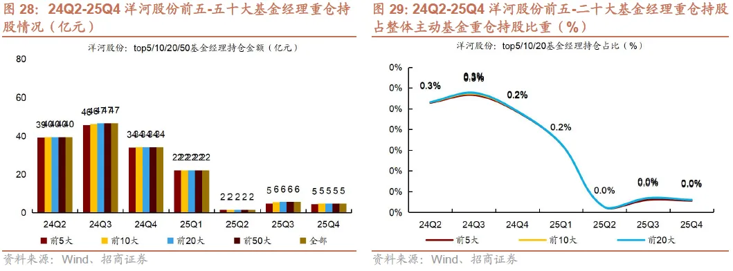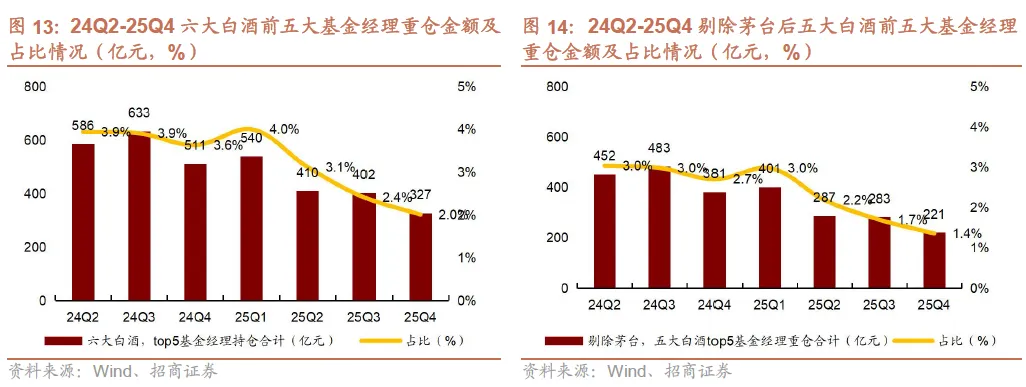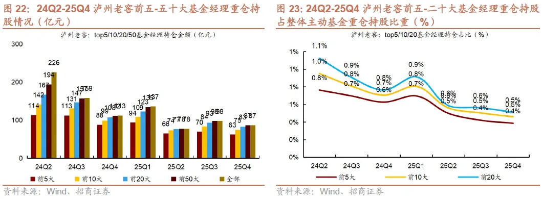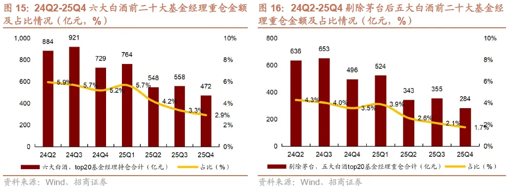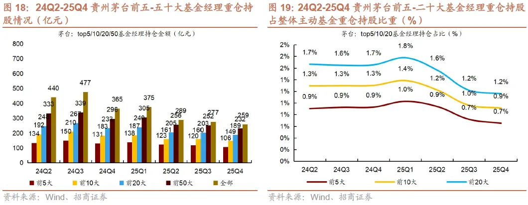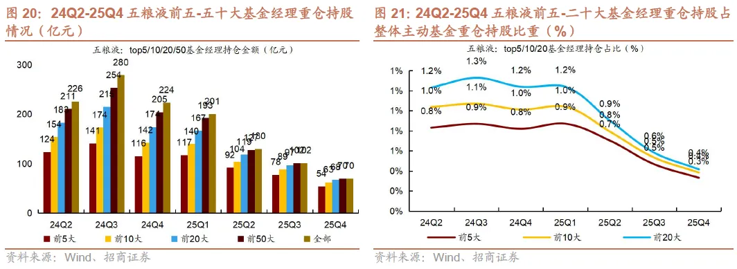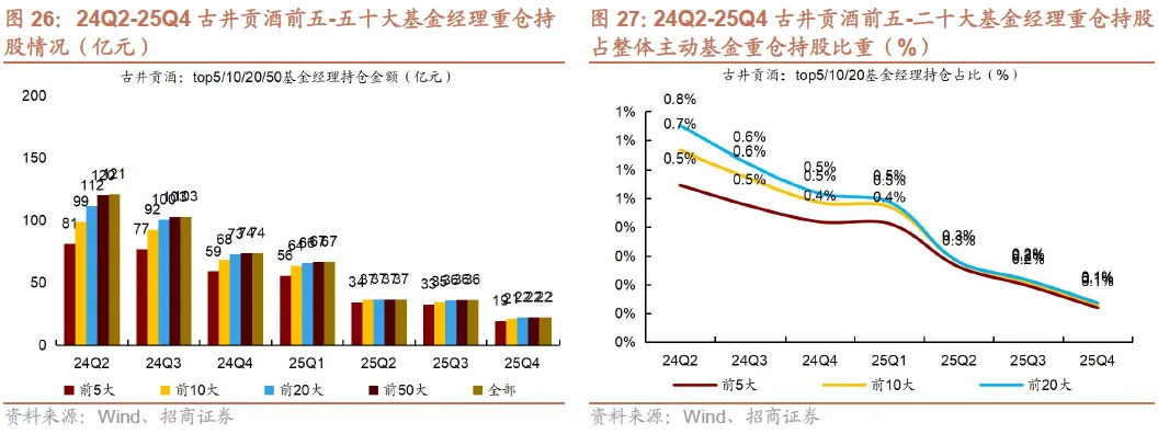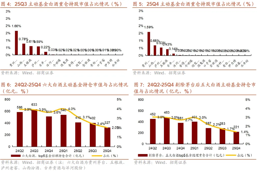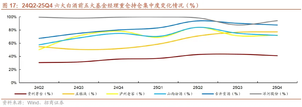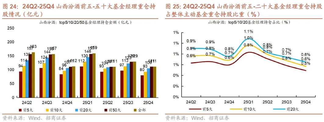 2)25Q4茅台、汾酒、古井持仓集中度下降。25Q4贵州茅台/五粮液/泸州老窖/山西汾酒/古井贡酒/洋河股份前五大基金经理重仓持仓占个股总重仓持仓比例同比-2.3pct/+0.6pct/+0.9pct/-3.4pct/-2.6pct/+6.5pct,茅台、汾酒、古井持仓集中度下降。