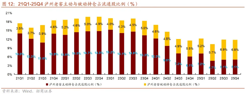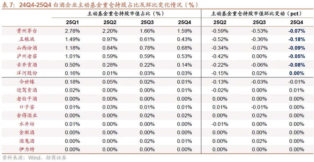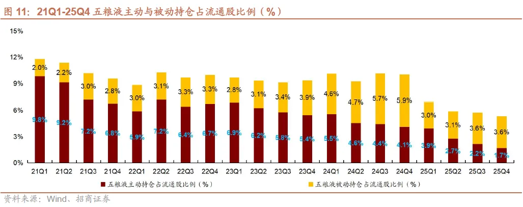 茅台主动/被动基金持仓占流通股比例持平、五粮液主动持仓下降、老窖被动持仓略有下降。25Q4贵州茅台/五粮液/泸州老窖主动基金持仓占流通股比例分别为1.5%/1.7%/5.1%,环比持平/-0.5pct/持平,被动基金持仓占流通股比例分别为5.2%/3.6%/6.8%,环比持平/持平/-0.1pct。