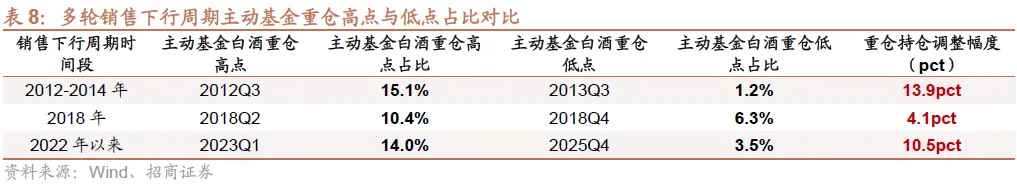 调整位置方面:1)综合对比前两轮销售下行周期白酒主动基金重仓情况,我们发现至25Q4,本轮白酒重仓占比已从高点回落10.5pct,调整幅度超过2018年,同时以超配比例统计,25Q4白酒板块超配比例仅为1.0%(相较于25Q3的1.2%继续下降),已低于13Q1-Q2水平,逐步接近13Q3-Q4水位。2)若剔除重点白酒赛道基金经理持仓,25Q3六大白酒重仓比例仅为1.8%,同样已至历史低位(接近13年水位)。