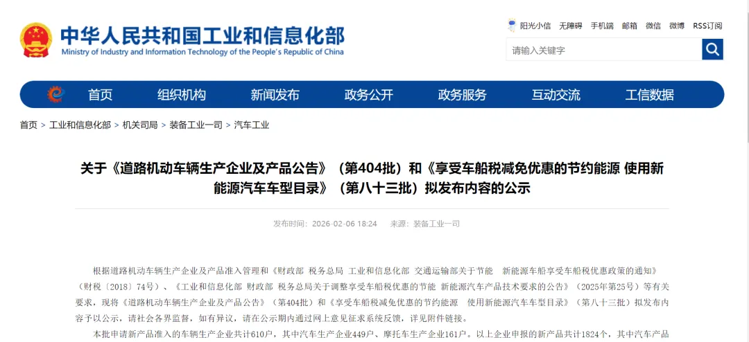 根据道路机动车辆生产企业及产品准入管理和《财政部 税务总局 工业和信息化部 交通运输部关于节能 新能源车船享受车船税优惠政策的通知》(财税〔2018〕74号)、《工业和信息化部 财政部 税务总局关于调整享受车船税优惠的节能 新能源汽车产品技术要求的公告》(2025年第25号)等有关要求,现将《道路机动车辆生产企业及产品公告》(第404批)和《享受车船税减免优惠的节约能源 使用新能源汽车车型目录》(第八十三批)拟发布内容予以公示,请社会各界监督,如有异议,请在公示期内通过网上意见征求系统反馈,详见附件链接。