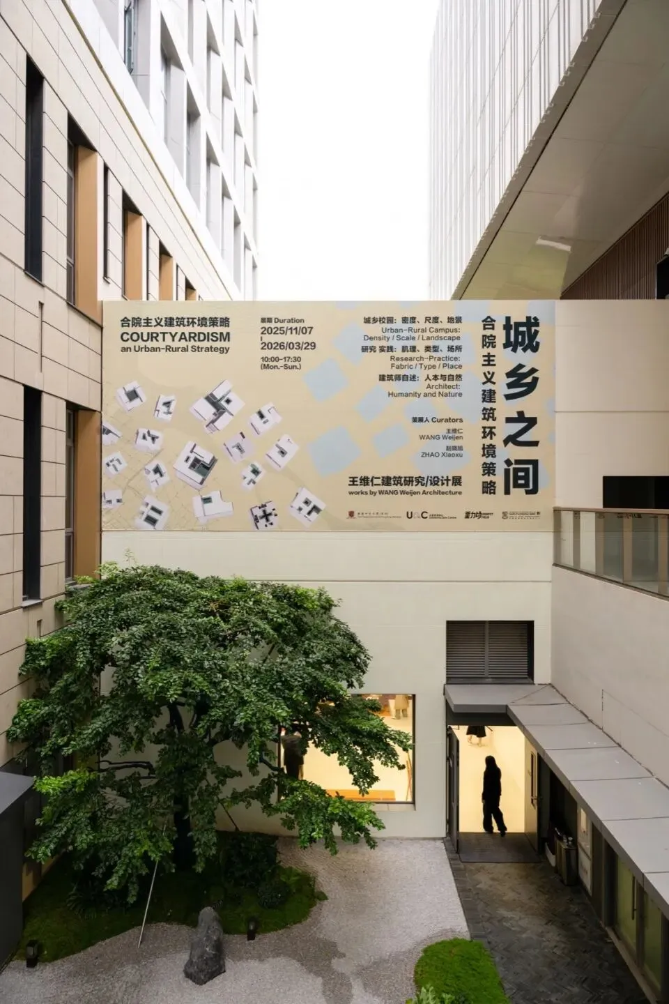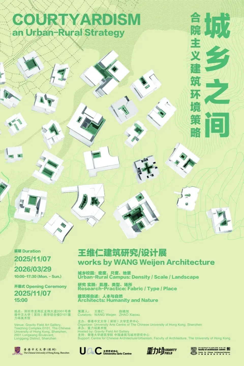 本次展览以“城乡校园:密度、尺度、地景”“研究实践:肌理、类型、场所”与“建筑师自述:人本与自然”三部分展开,从多重视角呈现王维仁建筑设计研究室近二十年来,以合院主义为建筑环境策略所展开的城乡实践。除了城乡校园与小区建筑的设计实践,展览也梳理了研究室在城乡环境中持续的田野式调查与研究,体现建筑师对人本尺度、生态自然与小区场所的坚持,以及游走于城乡之间的工作日常。