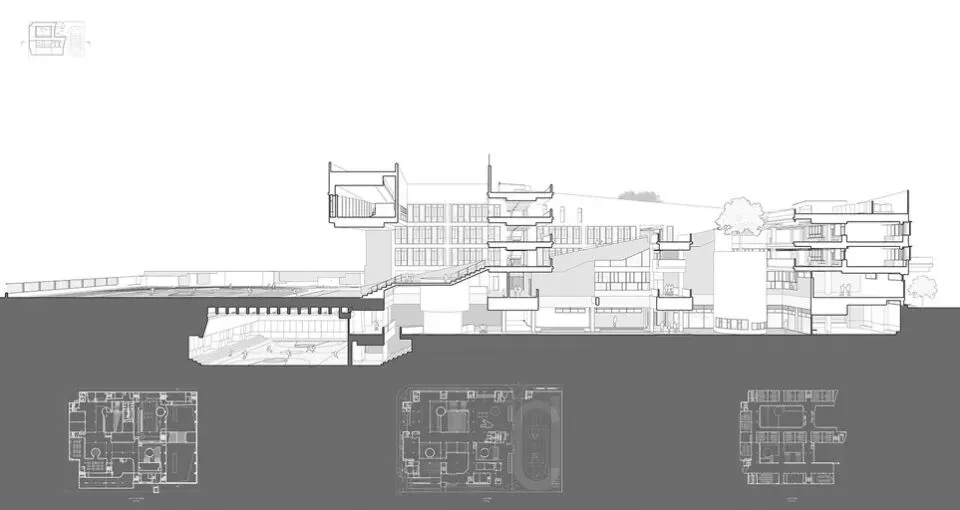 在深圳这几个校园建筑的探索过程中,合院主义发展成为一种高密度校园的设计策略,将合院的空间形式的核心由平面扩大为剖面。作为一种剖面的空间关系,设计透过地面层的抬高,形成校园低、中、高的多层院落平台,建立一种立体的院落空间系统。合院主义进一步透过院落之间的串连与序列,以及平台与穿廊的过渡空间,让校园建立一种社区般的城市空间关系,更在其中引入大树、草地与水塘,以及远观山体湖泊,把自然带入院落的生活空间。