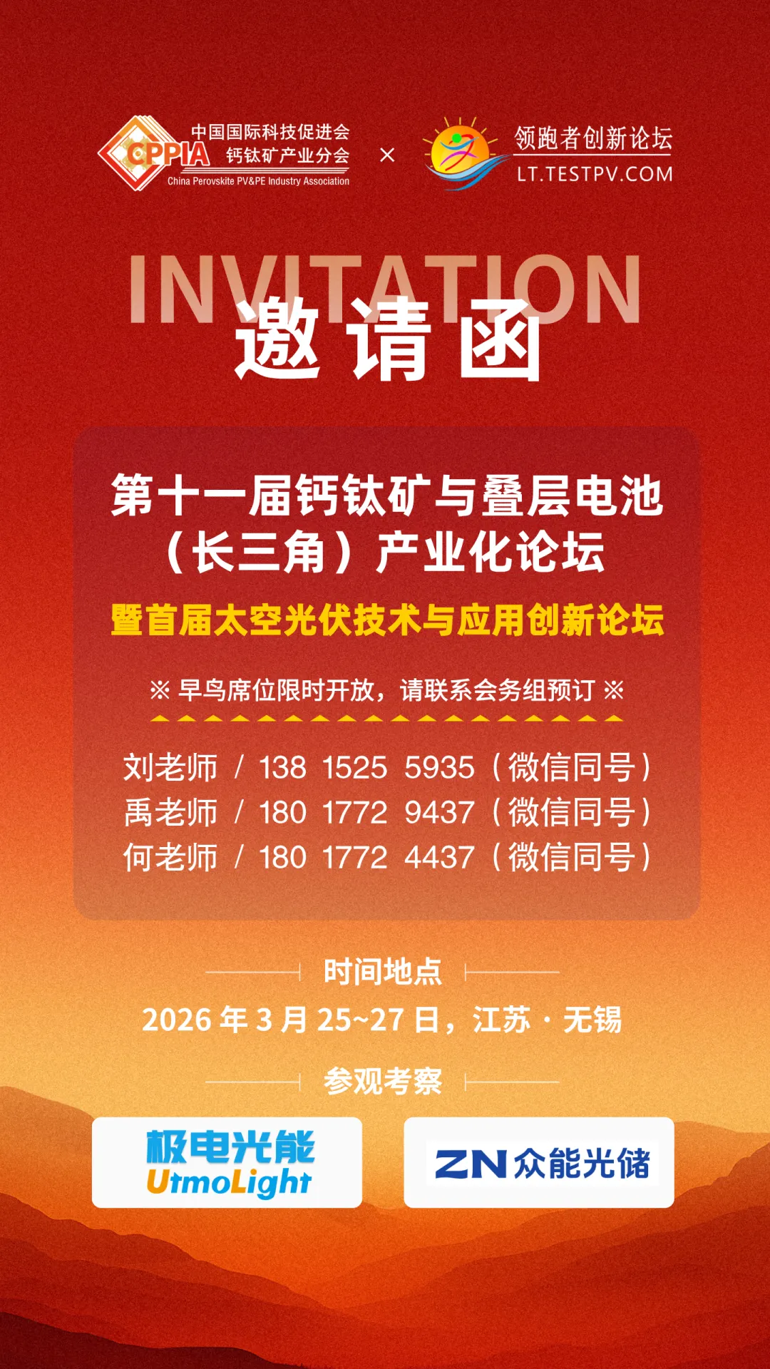 会议通知:政策、技术、资本三重驱动,钙钛矿叠层电池产业化浪潮已至!2026年3月25-27日,第十一届钙钛矿与叠层电池产业化论坛暨首届太空光伏创新论坛,汇聚全行业专家,发布高效率、高稳定性前沿成果,打通材料、装备、标准到投资全产业链。会议同期将参观考察极电光能、众能光储等公司。