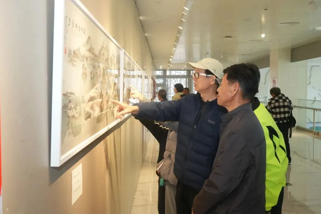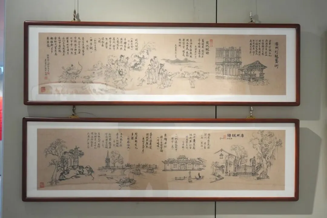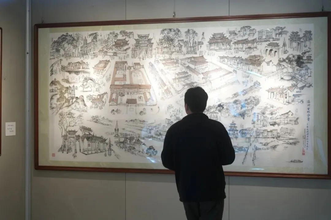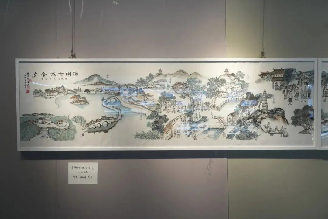 画家林志明以入选芗城区非遗的闽南传统绣像技艺为核心,用笔墨勾勒漳州千年历史。展厅内,12米长卷《漳州古城20公里文化走廊》尤为震撼,青石板路、燕尾脊古厝、骑楼老街等景致跃然纸上,生动再现古城今昔风貌与闽南人文底蕴。