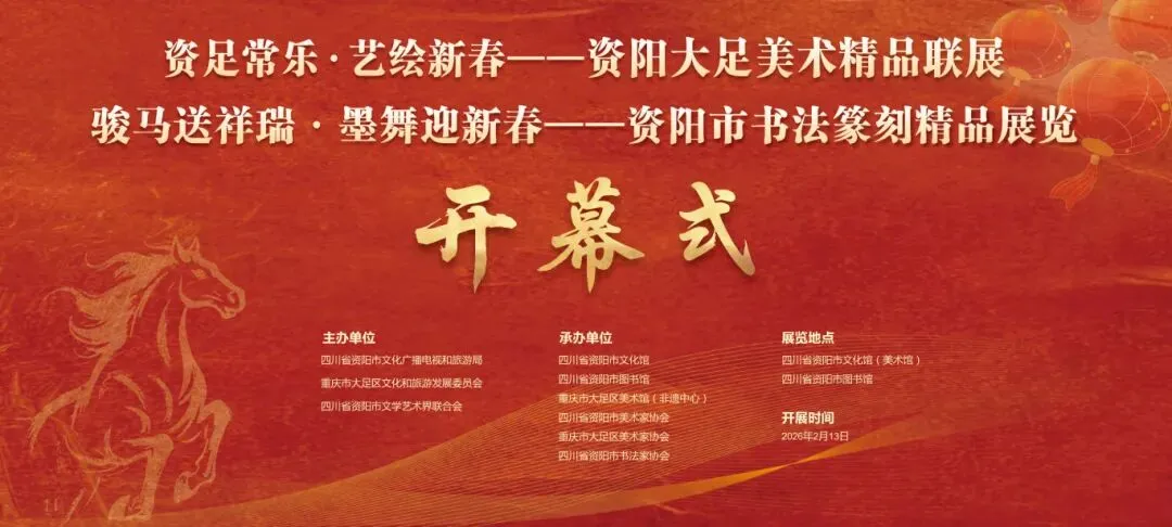 由四川省资阳市文化广播电视和旅游局、重庆市大足区文化和旅游发展委员会、四川省资阳市文学艺术界联合会主办,四川省资阳市文化馆、四川省资阳市图书馆、重庆市大足区美术馆(非遗中心)、四川省资阳市美术家协会、重庆市大足区美术家协会、四川省资阳市书法家协会承办的“资足常乐·艺绘新春”资阳大足美术精品联展暨“骏马送祥瑞·墨舞迎新春”资阳市书法篆刻精品展览将于2026年2月13日上午10:00 在资阳市文化馆举行开幕仪式,本次展览共展出美术、书法作品200件,欢迎广大市民朋友前来观展!