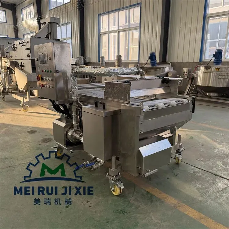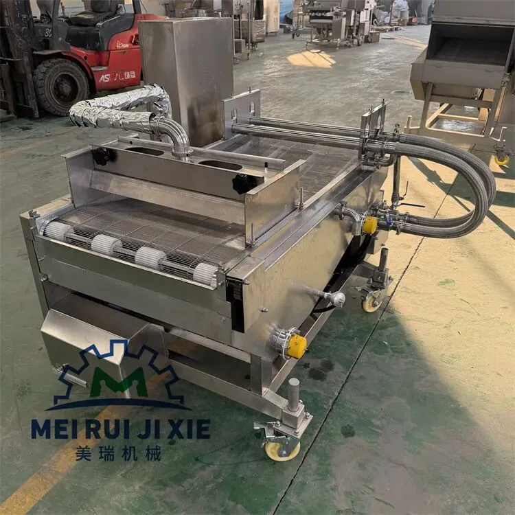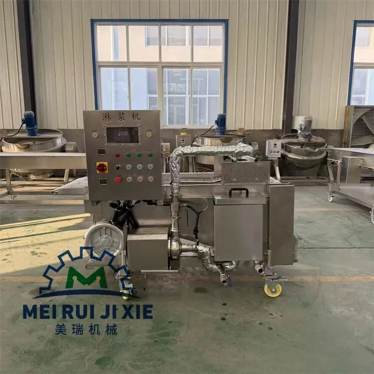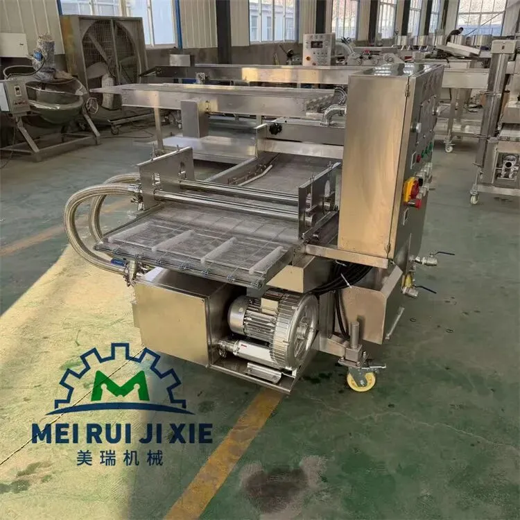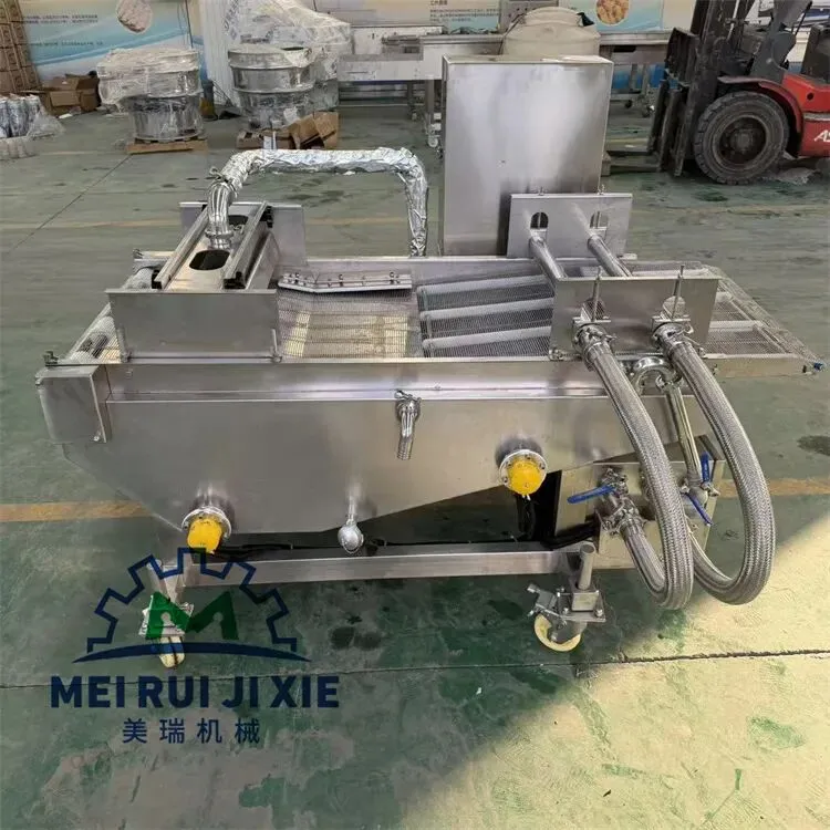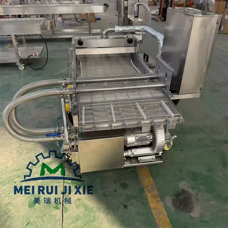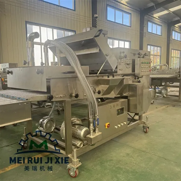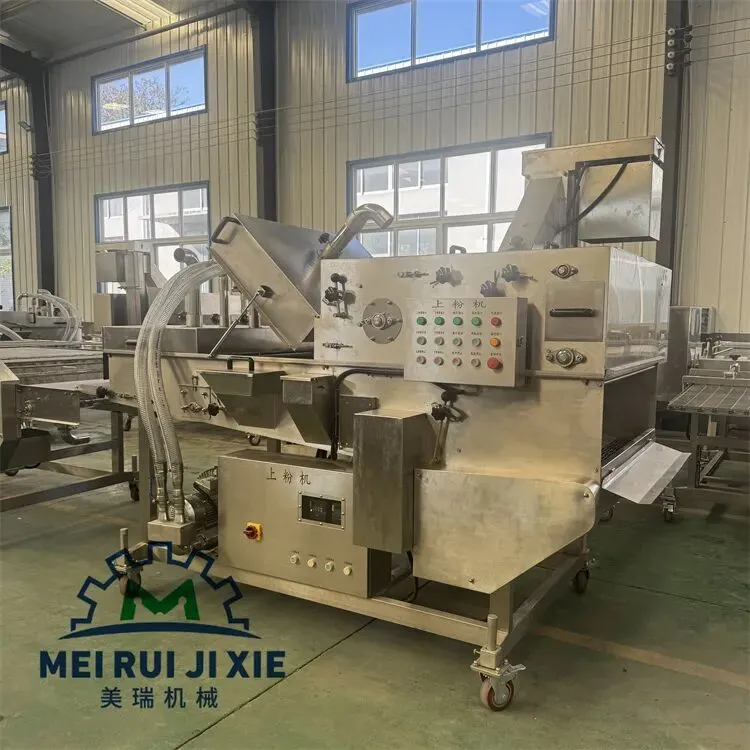 产品通过传送网带时被均匀的裹涂上一层混合粉,以适应下道工序的要求,可以同上浆机、上面包屑机连接,组成不同产品的生产线。从而完成粉、浆、粉,浆、粉及浆、粉、粉工艺。