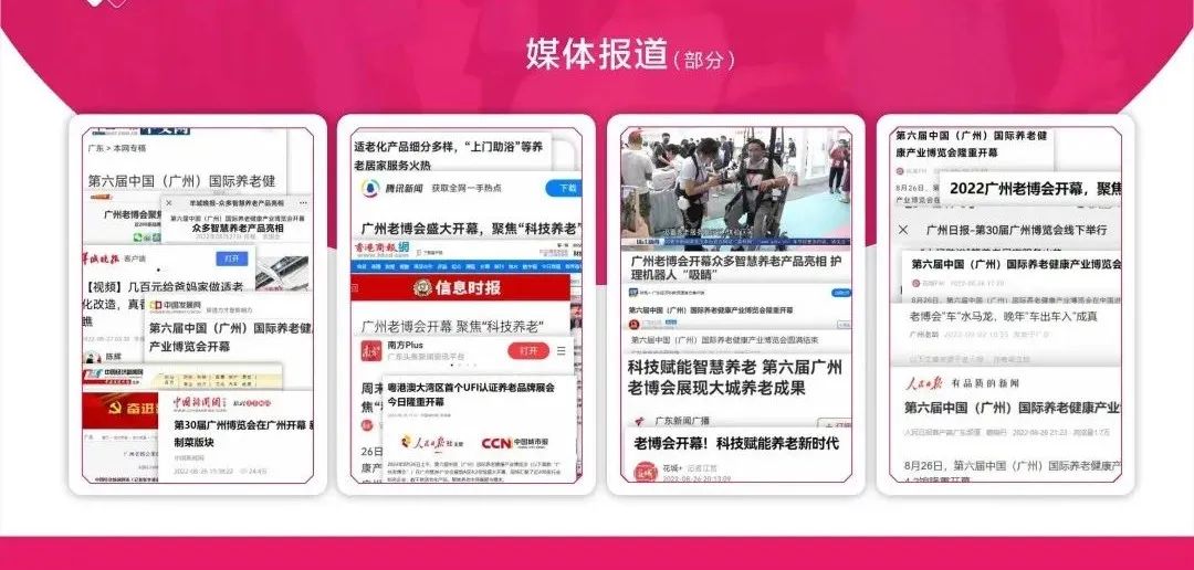 EE老博会搭建“全媒体聚焦,多矩阵扩散”的营销传播宣传矩阵,紧跟新媒体时代视频化浪潮,立体式进行展会宣传,有效助力企业树立品牌形象,助推老龄产业高质量融合发展。与50+权威媒体建立深度合作,覆盖省市级媒体,垂直行业媒体、各大门户网站等,2000+条媒体报道通过逛展直播、媒体实拍、活动报道等形式,沉浸式地带大家直击展会精彩盛况。