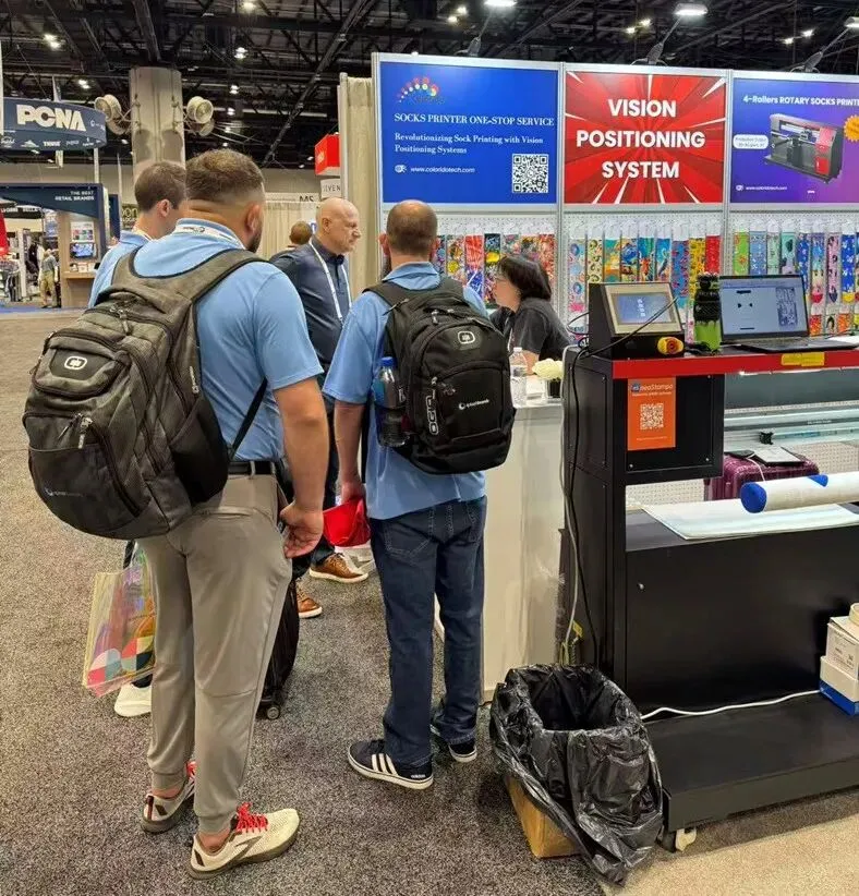 此次参展的多款圆筒无缝AI打印设备,涵盖两轴、四轴等多种形态。通过锐嘉科AI视觉方案的实践,实现图形精准打印,让胚袜图案颜色衔接更加自然顺滑,为袜体打印的规模化、高品质生产提供了有力支撑。