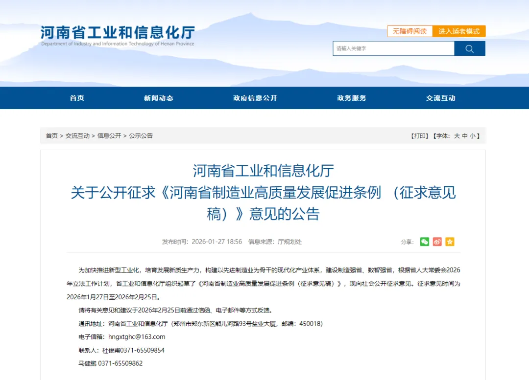 1月27日,河南省工业和信息化厅就《河南省制造业高质量发展促进条例(征求意见稿)》公开征求意见。