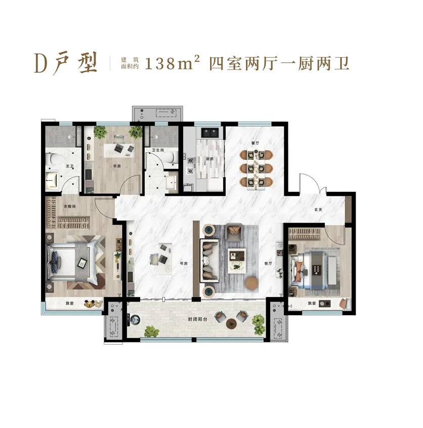 建面约138㎡奢阔大宅,3+1百变布局、约7.2米阔景双阳台设计、主次卧南向双飘窗。