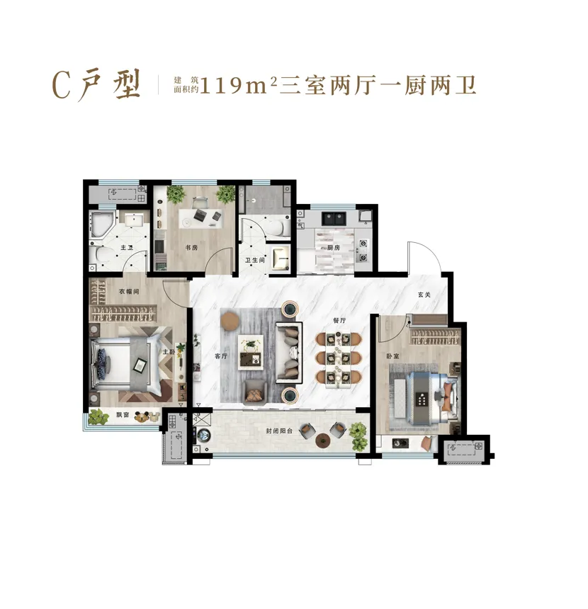 建面约119㎡朗阔大三室,全明户型、奢享约6米宽景阳台、餐客厅一体式布局。