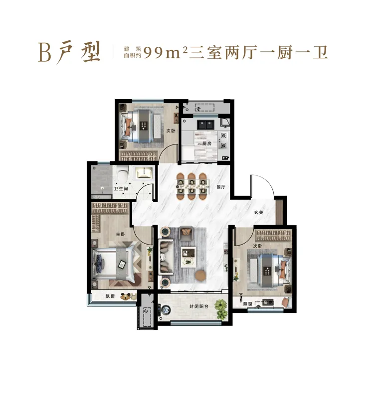 建面约96㎡全能三居,三开间朝南、全明设计、宽阔观景视野。