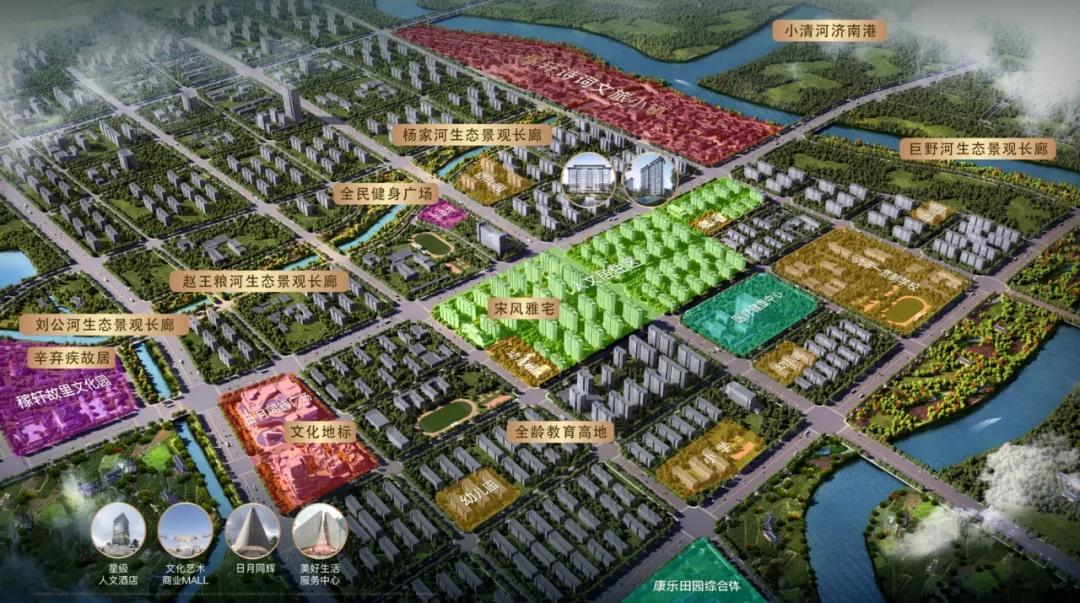 稼轩文旅城承接双国家战略叠加、三区利好交汇,毗邻中华母亲河—黄河,处于小清河、巨野河、杨家河、赵王运粮河多河环抱的区域,四面环水、风景宜人。同时以稼轩文化为核心,文旅产业为支撑,依托稼轩故里,深挖当地自然禀赋、文化底蕴,打造稼轩故里文化园、诗词文旅小镇、康乐田园综合体三大文旅核心,构建“一环、一轴、二城、多园”的空间格局和新一代城市田园漫生活体系,实现文旅、生态、生活的有机融合、协同发展,使千年稼轩故里重焕新生。